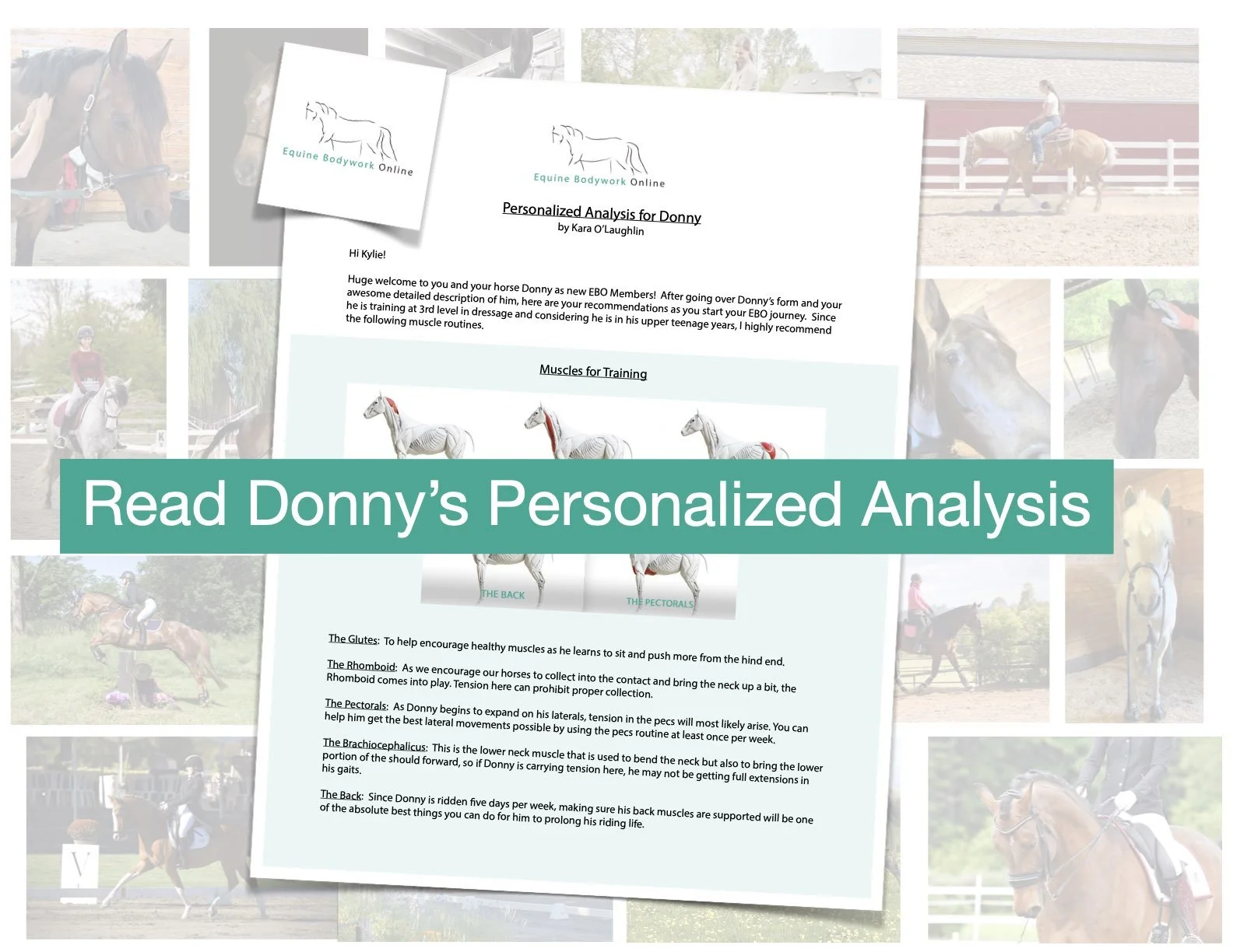 You will be guided through a form with specific questions related to your horse’s condition and activity. Once the form is complete, Kara will review your answers and create your personalized analysis. It will be emailed to you in a PDF format with recommendations of muscles and stretches to work on in order to help your horse get the most out of EBO.
